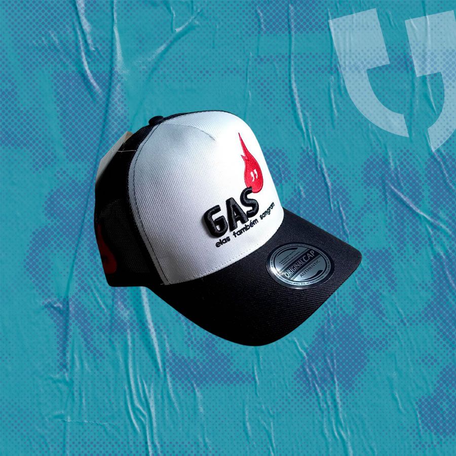 Estampa frontal bordada com logo do GAS, nome por extenso nas comunidades, lateral com logo e costas com endereço da página do Instagram.
